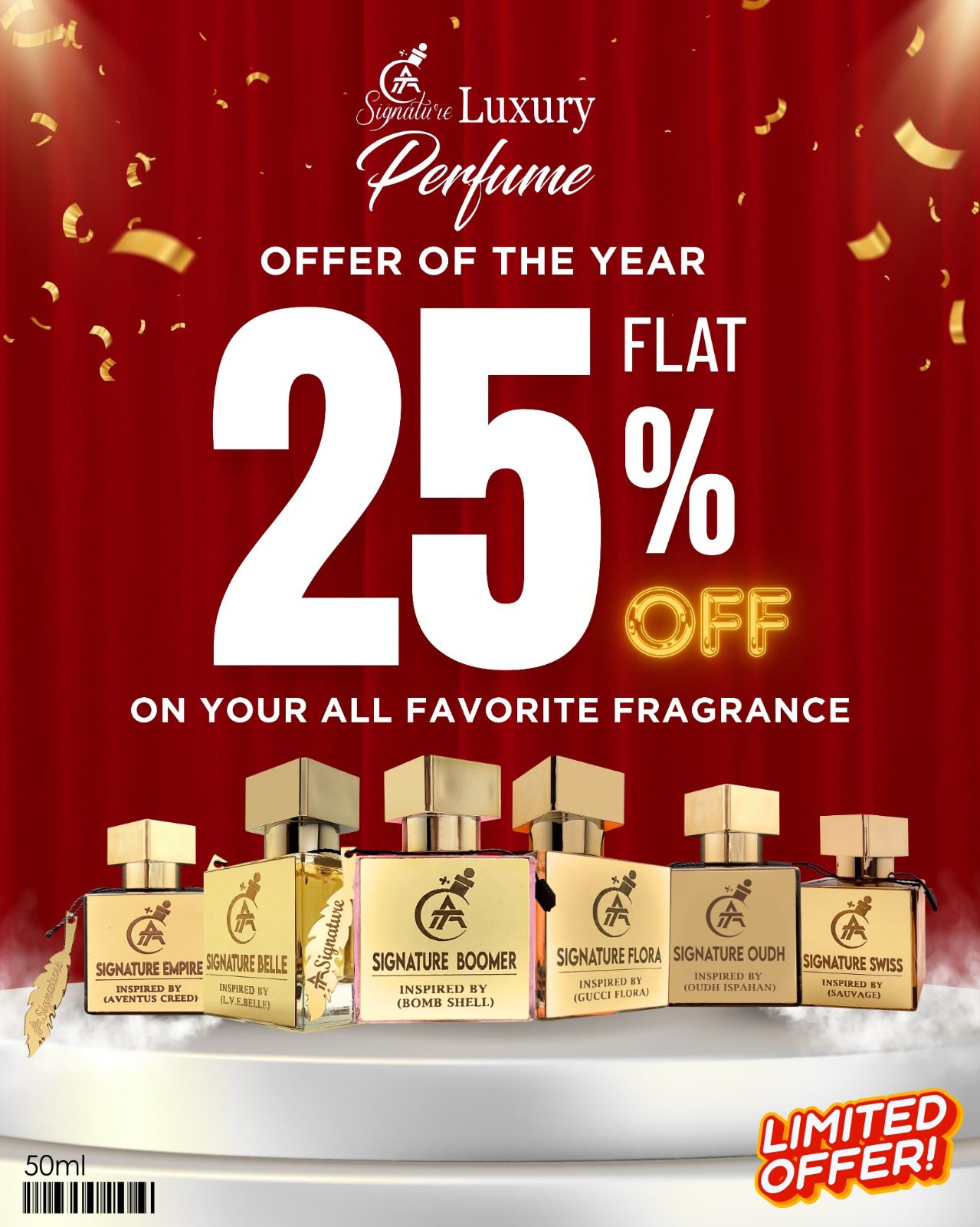 Signature Boomer offers a vibrant, fruity burst inspired by Bombshell, blending pineapple, berries, and jasmine for a flirty, energetic vibe. Signature Belle, inspired by La Vie Est Belle, is a sweet and elegant floral gourmand with iris, patchouli, and vanilla that radiates positivity. Signature Flora captures the essence of Gucci Flora with a soft floral heart of peony and rose, balanced by citrusy freshness and warm pink pepper. Signature Empire, inspired by Creed Aventus, delivers a powerful masculine scent with fruity top notes, smoky birch, and musky undertones — bold and timeless. Signature Oudh, reflecting Oud Ispahan, is deep and oriental with rich oud, floral heart, and woody base notes for a royal, long-lasting aura. Signature Swiss, inspired by Sauvage, is a refreshing mix of citrus, spice, and amber woods — perfect for confident, everyday wear.